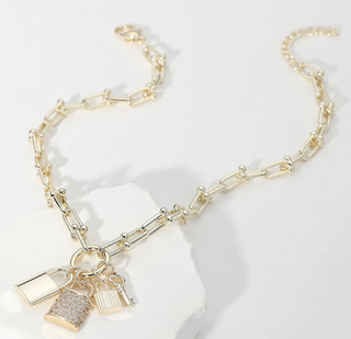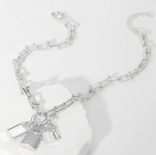 14K Gold Plated Cz Paved Triple Lock Pendant Chain Necklace